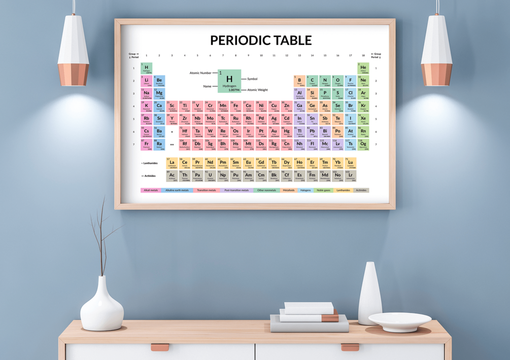 Periodic Table of the elements poster which shows atomic number, symbol, name and atomic weight for all 118 elements in a color-coded table.